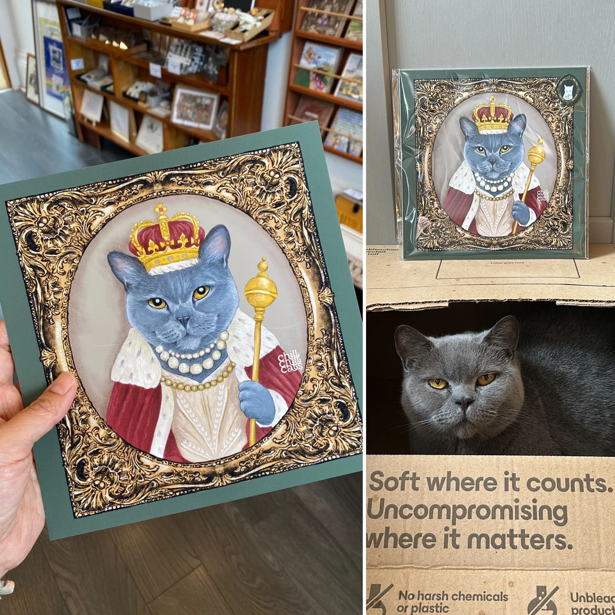 chillchillcats crafts each portrait by blending the style and colours of noble, aristocratic and exaggerated accessories with the unique characteristics of each pet. You can mix and match different elements such as the engraved frame, pet accessories and background pattern/colour on your pet portrait.
