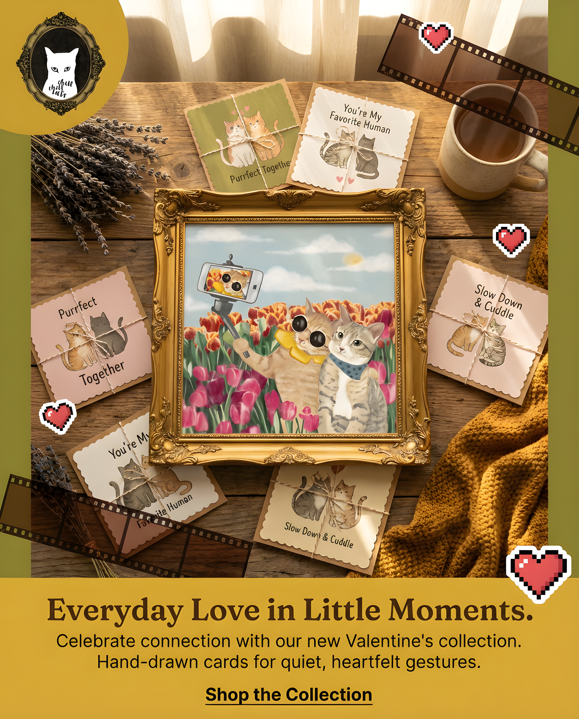 Alongside the illustrations, we offer a selection of Valentine’s greeting cards, thoughtfully designed to express love in an honest and heartfelt way. Perfect for couples who value sincerity over grand gestures, these pieces are made to remind someone special that love lives in the small, ordinary moments.