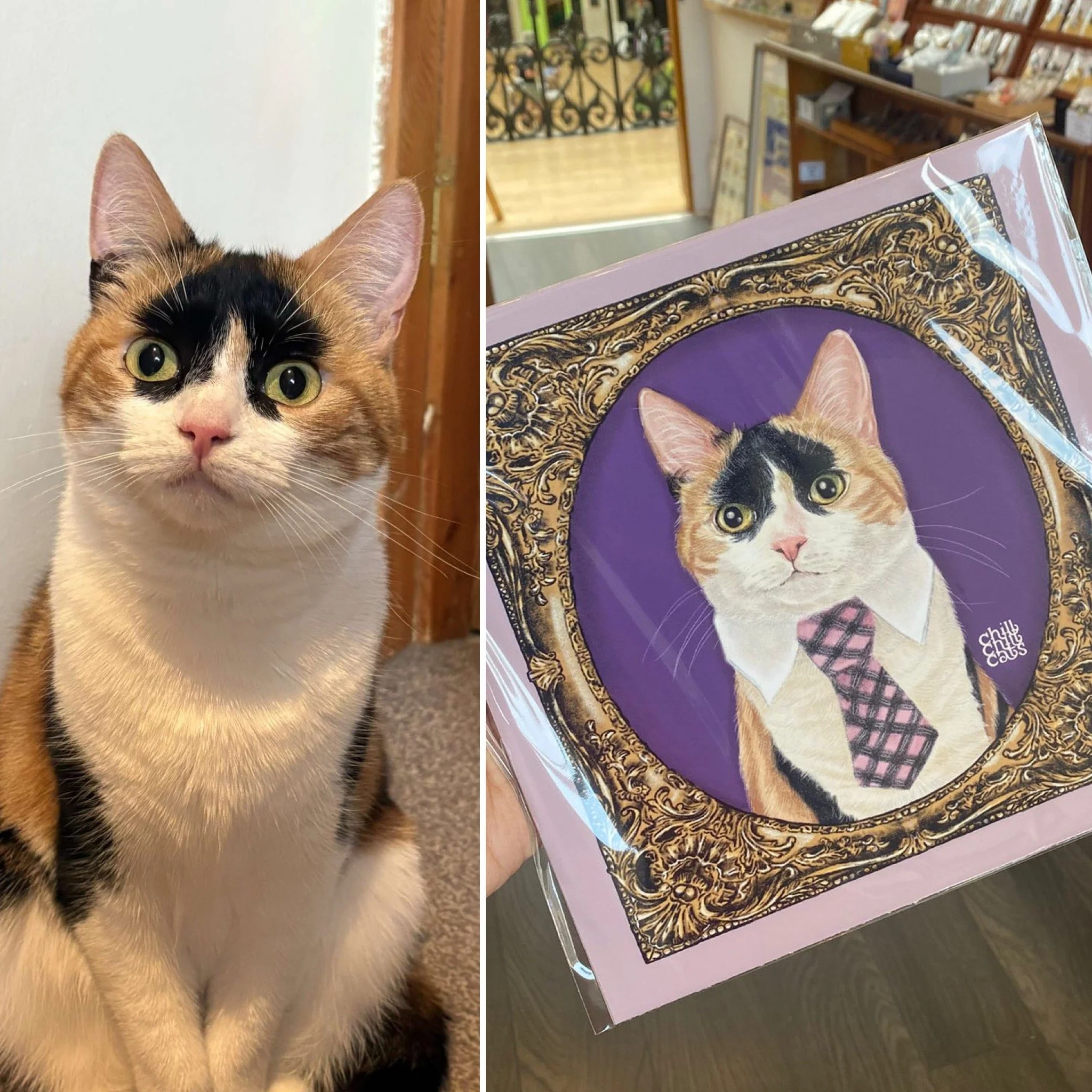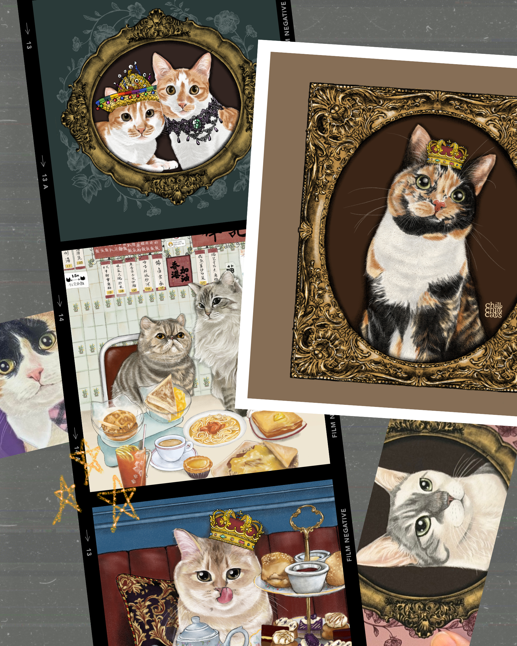 You can choose any of chillchillcats’ illustration as your pet portrait background, the popular backgrounds are “hk cafe” and “high tea”. Click below for more information such as size and price.