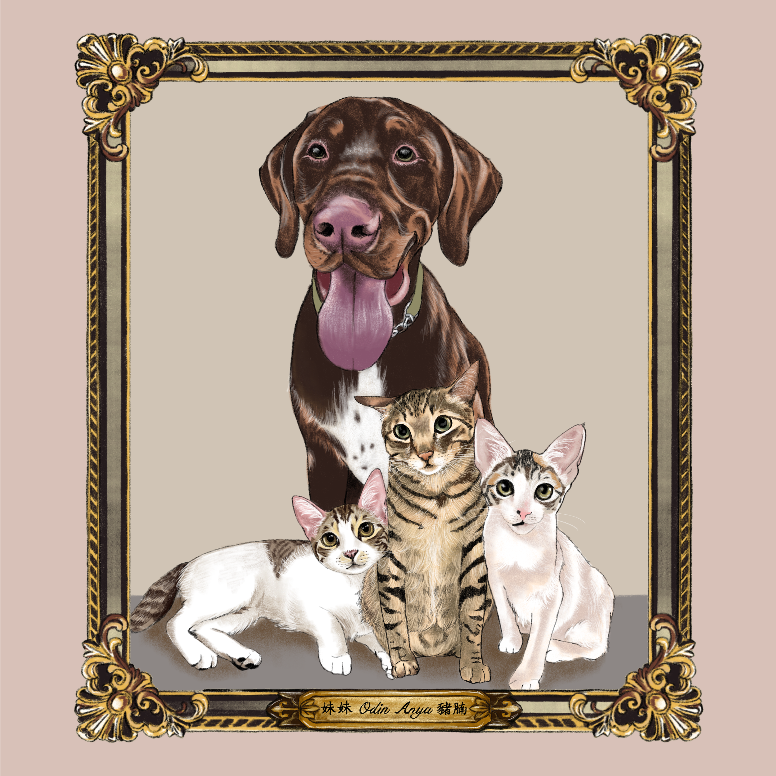 The Noble Style Pet Portrait features an illustrated gold-engraved frame as part of the artwork (not a physical frame), with the pet accessories that you can select from our signature templates. You can see more samples, size and price from the link below: