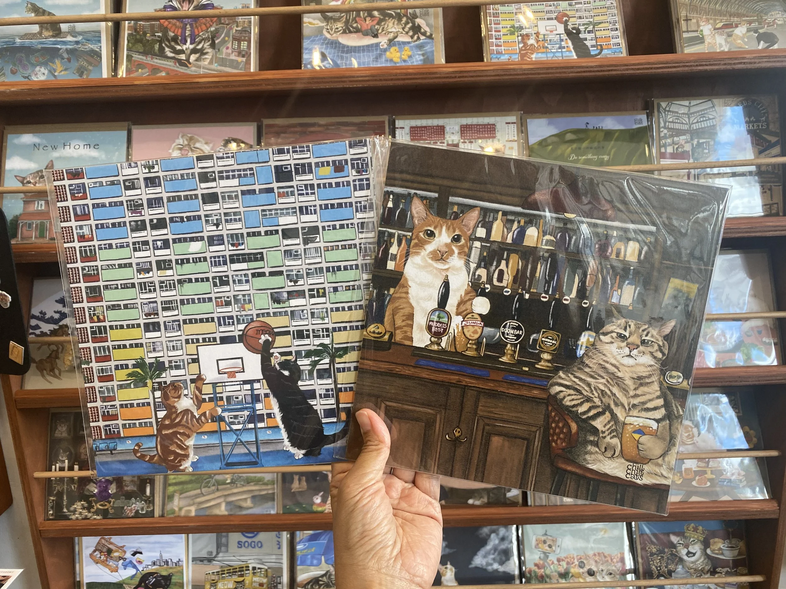This whimsical art print by ChillChillCats reimagines everyday life through feline eyes. Blending iconic elements of Hong Kong culture and UK living, the illustration transforms humans into charming cats—each living their best nine lives across two worlds.