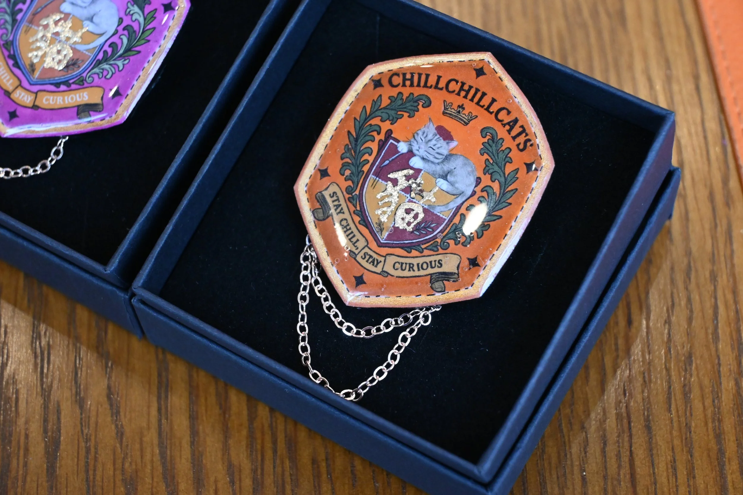 ChillChillCats Academy is our enchanted new line, featuring handmade cat brooches and other whimsical creations inspired by secret societies, ancient spells, and feline professors who nap between lectures.